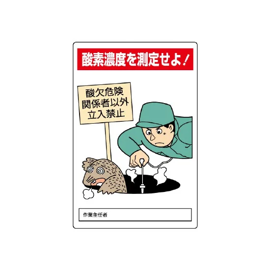 作業前の酸素濃度測定を、イラスト入りで分かりやすく促せる安全標識。