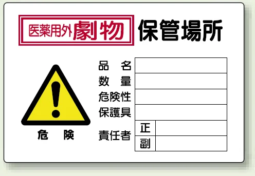 横型レイアウトで医薬用外劇物の保管場所を分かりやすく示せる管理標識。