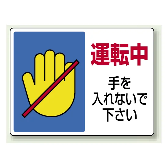 - ヨコ型 はさまれ・巻き込まれ注意標識 エコユニボード 225×300 運転中 手を入れないで下さい (807-07)