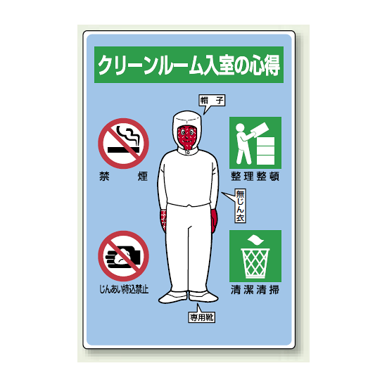 商品説明:クリーンルーム入室の心得 全身イラスト エコユニボード 450×300 (816-41A)
