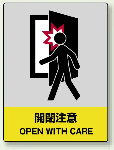 扉の開閉時の注意喚起を、ひと目で伝える警告標識。