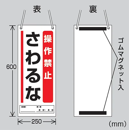 大きくて見やすい 点検中の操作禁止を、吊り下げとマグネットの両用で分かりやすく伝えられる標識。