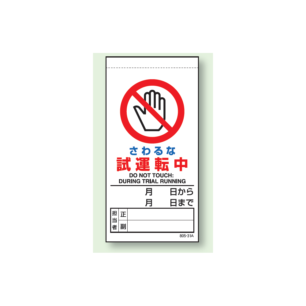 商品説明:さわるな試運転中 上部マグネット入ビニール標識 (805-31B)
