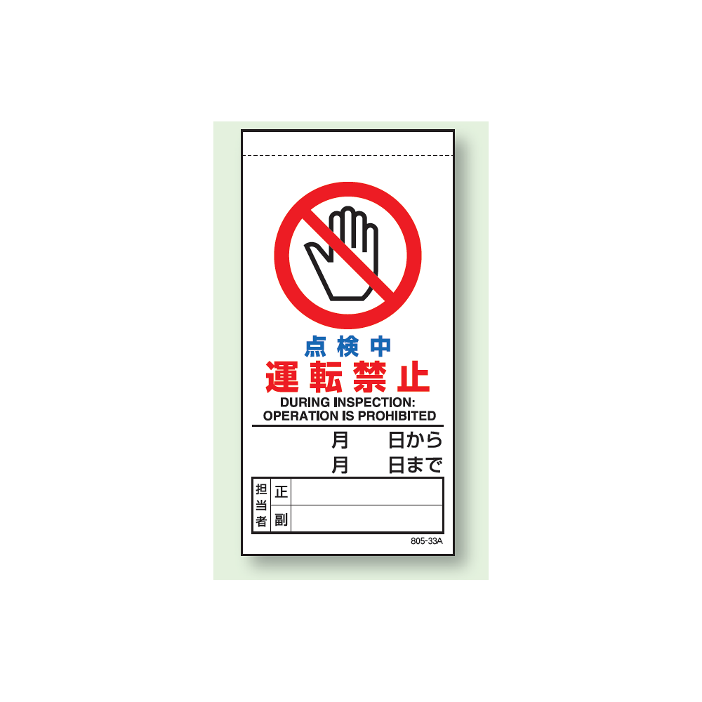 商品説明:点検中運転禁止 上部マグネット入ビニール標識 (805-33B)