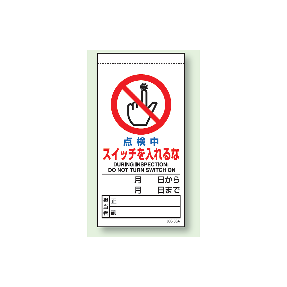 商品説明:点検中スイッチを入れるな 上部マグネット入ビニール標識 (805-35B)
