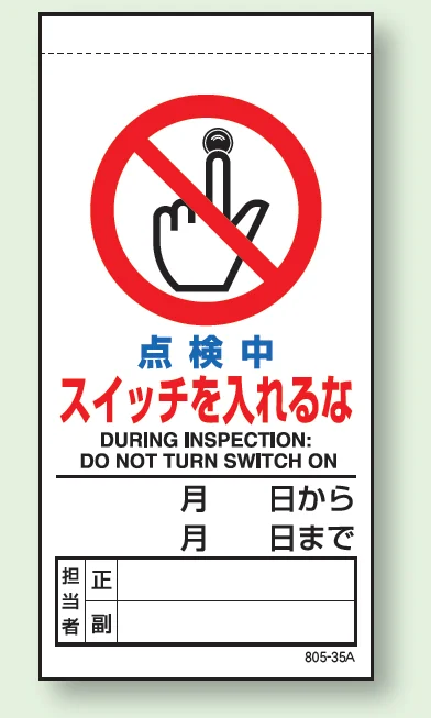 点検中のスイッチ投入禁止を、上部マグネット付きでしっかり伝えられるビニール標識。
