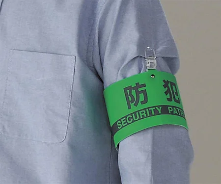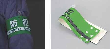 - 蛍光グリーン地に反射表示を施した、防犯活動向けの腕章です。
