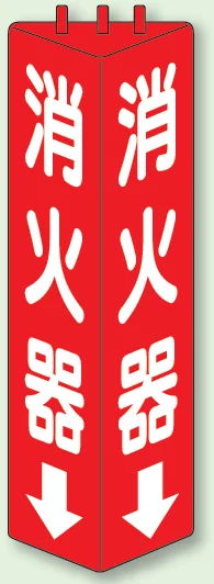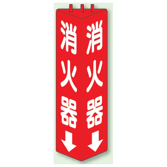 - 三面から視認しやすい三角柱形状で、消火器の位置を下方向へ案内できる標識です。