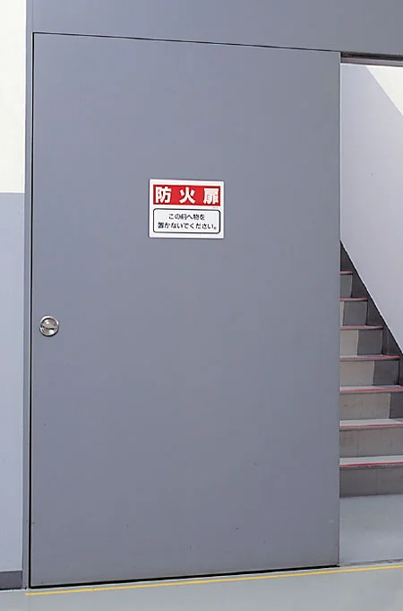 防火扉前のスペース確保をしっかり案内できる注意表示板。
