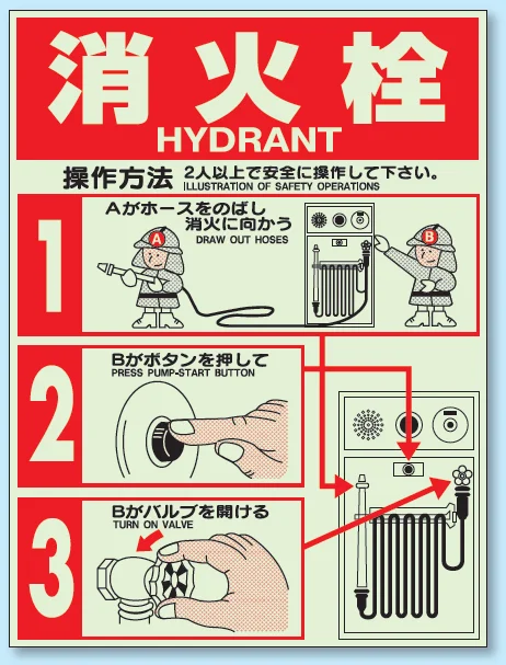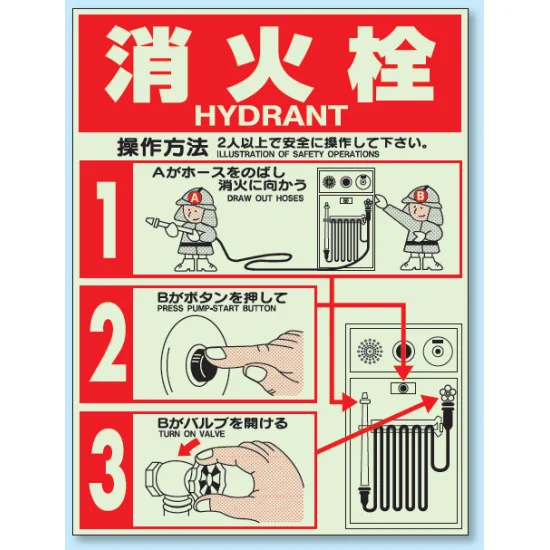 消火栓の操作手順を図入りで分かりやすく案内できる表示板。