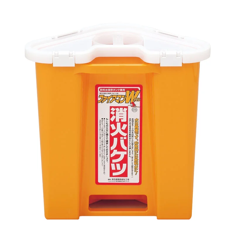 密閉型で一度に全ての水が出ず、5回に分けて水がでます。 置き場所を分かりやすく確保しやすい、樹脂製の消火バケツ。