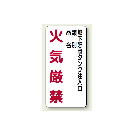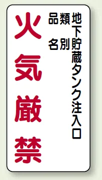 - 地下貯蔵タンク注入口まわりで、火気厳禁を明確に表示したい場所に適した標識です。