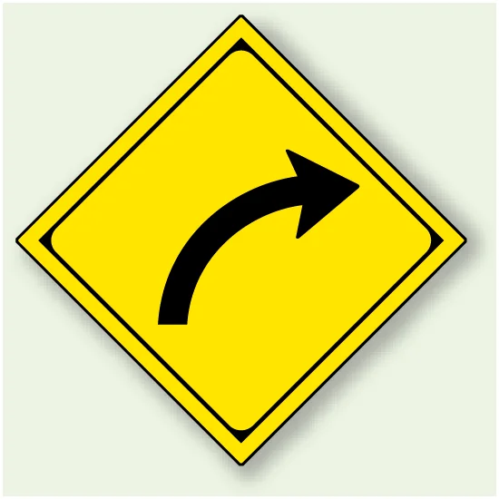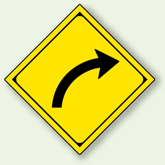 - 構内通路や施設内道路で、右へ緩やかにカーブする場所の手前に適した表示です。