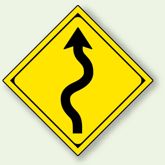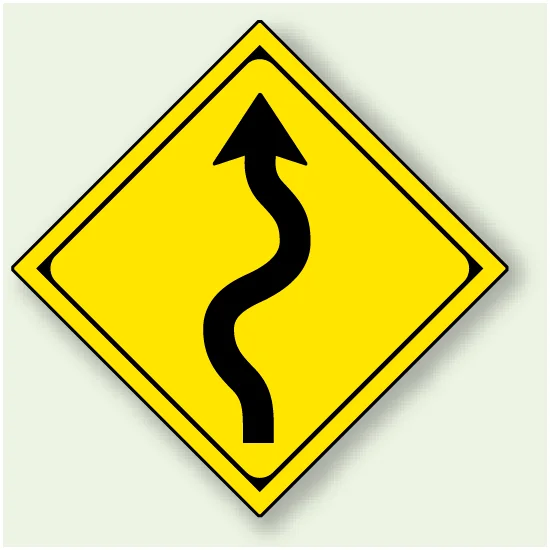 道路の曲がりが続く場所を、ひと目で注意喚起できる構内用警戒標識です。