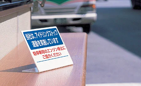 - 受付や守衛所などのカウンターまわりに置きやすく、駐停車時のエンジン停止協力を促す表示として使えます。
