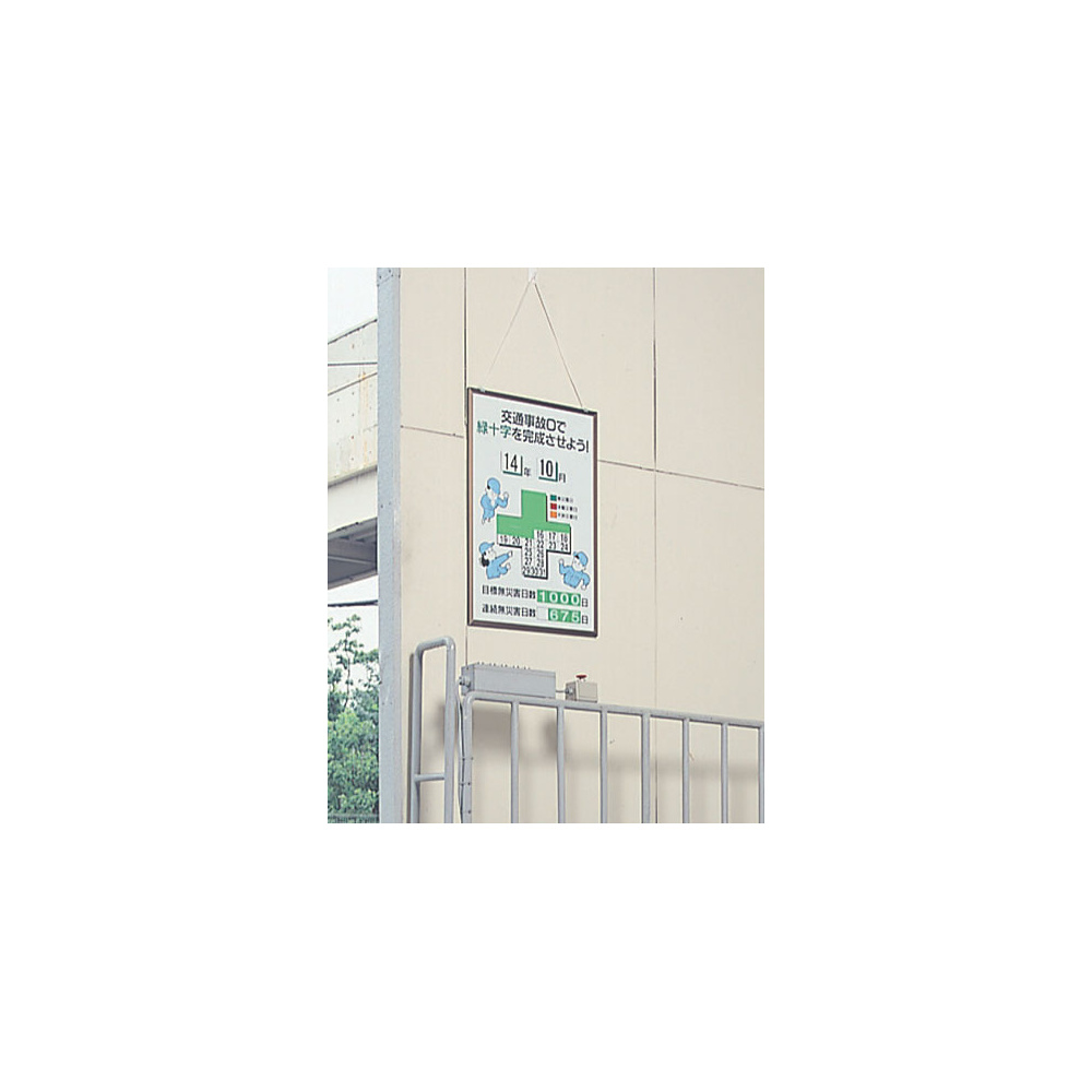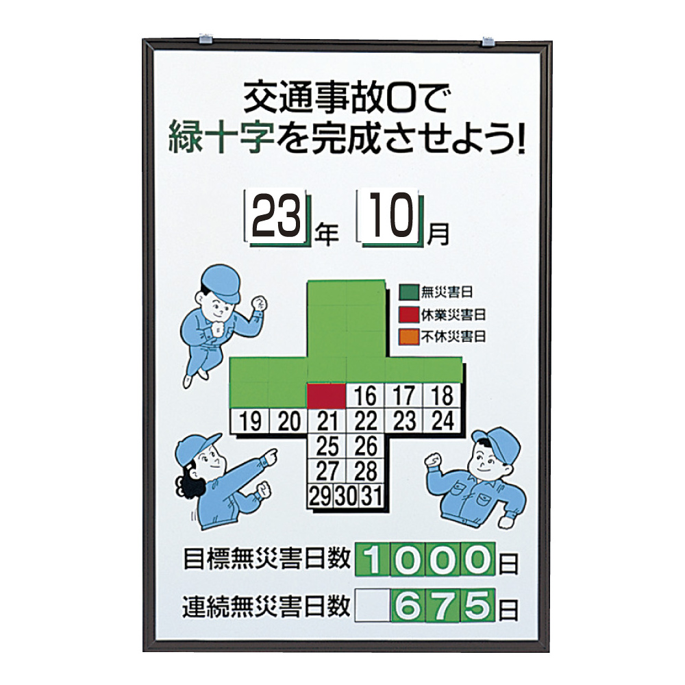 商品説明:無災害記録表 交通事故0で緑十字を完成させよう カラー鉄板/アルミ枠 900×600 セット (867-16)