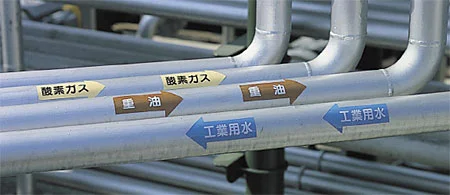 酸素ガス用に。流体名と方向を一度に表示できる配管方向用矢印ステッカー