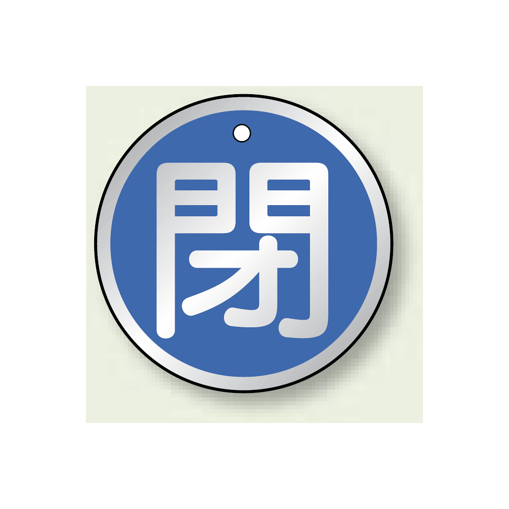 商品説明:アルミ製バルブ開閉札 丸型 閉 (青地/白字) 両面表示 5枚1組 サイズ:50mmφ (857-11)