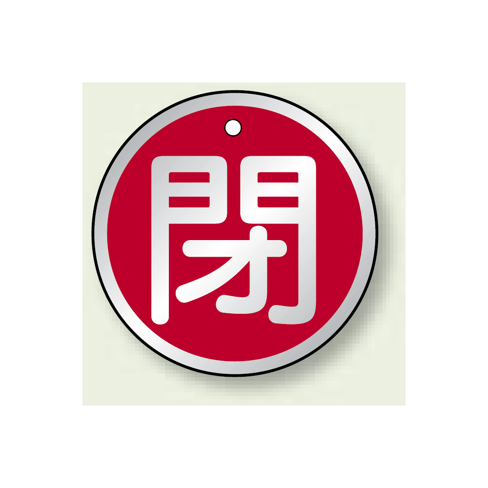 商品説明:アルミ製バルブ開閉札 丸型 閉 (赤地/白字) 両面表示 5枚1組 サイズ:50mmφ (857-12)