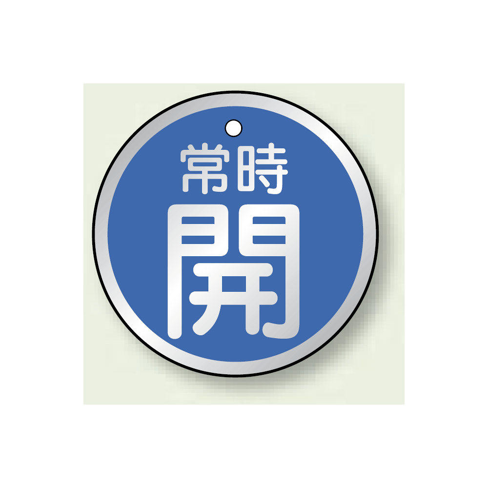 アルミ製バルブ開閉札 丸型 常時開 (青地/白字) 両面表示 5枚1組 サイズ:50mmφ (857-23)
