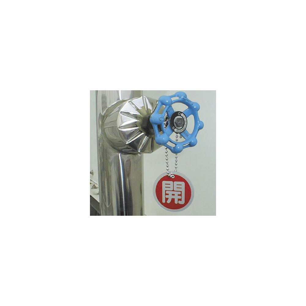 商品説明:アルミ製バルブ開閉札 丸型 常時開 (青地/白字) 両面表示 5枚1組 サイズ:50mmφ (857-23)
