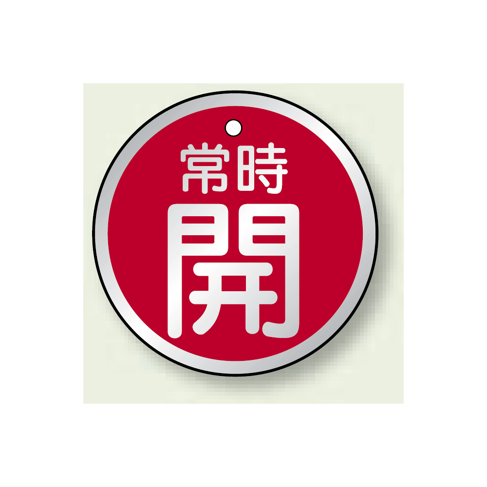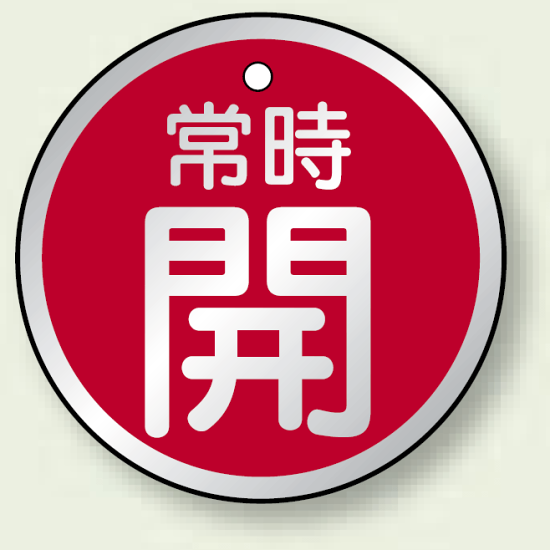 アルミ製バルブ開閉札 丸型 常時開 (赤地/白字) 両面表示 5枚1組 サイズ:50mmφ (857-24)