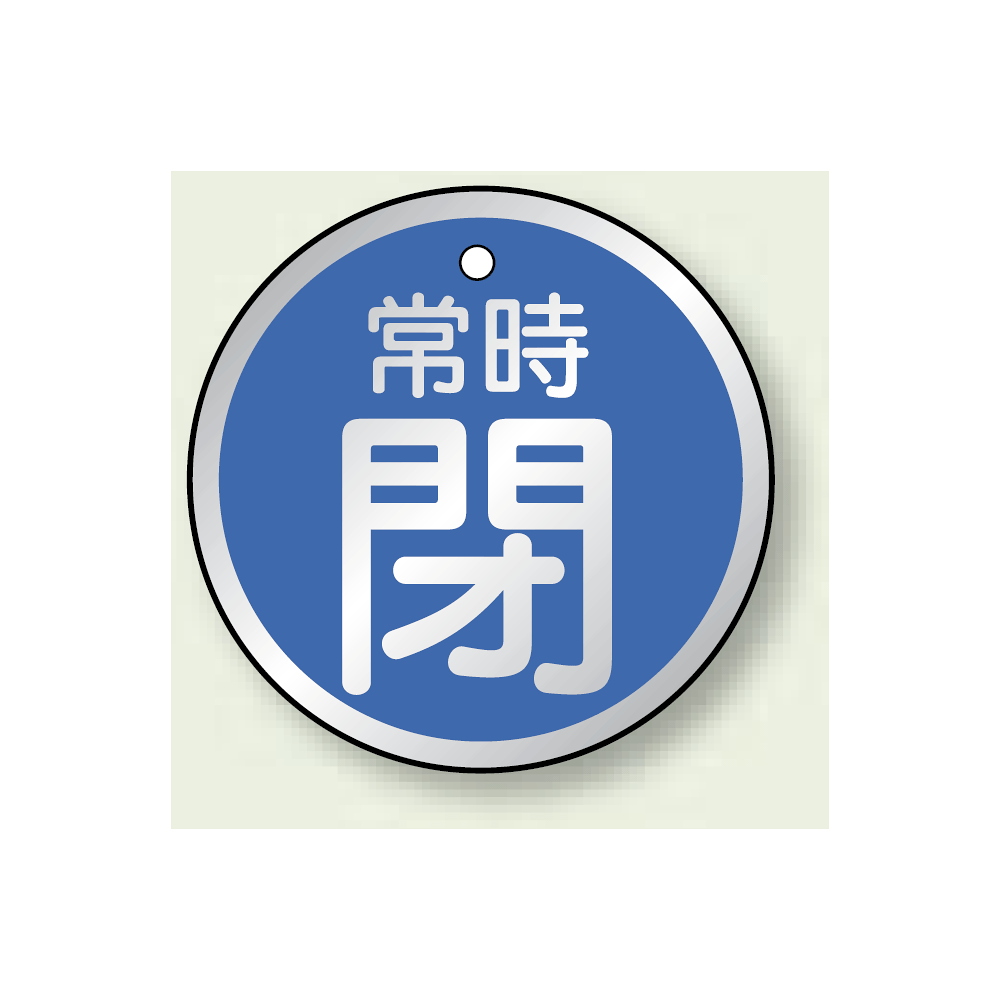 アルミ製バルブ開閉札 丸型 常時閉 (青地/白字) 両面表示 5枚1組 サイズ:50mmφ (857-25)