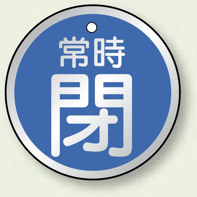 よくある質問:アルミ製バルブ開閉札 丸型 常時閉 (青地/白字) 両面表示 5枚1組 サイズ:50mmφ (857-25)