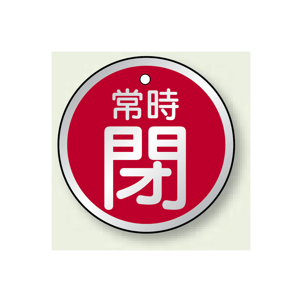商品説明:アルミ製バルブ開閉札 丸型 常時閉 (赤地/白字) 両面表示 5枚1組 サイズ:50mmφ (857-26)