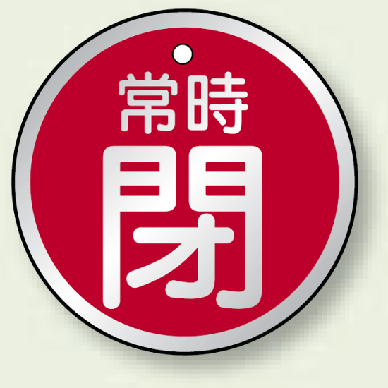 アルミ製バルブ開閉札 丸型 常時閉 (赤地/白字) 両面表示 5枚1組 サイズ:50mmφ (857-26)
