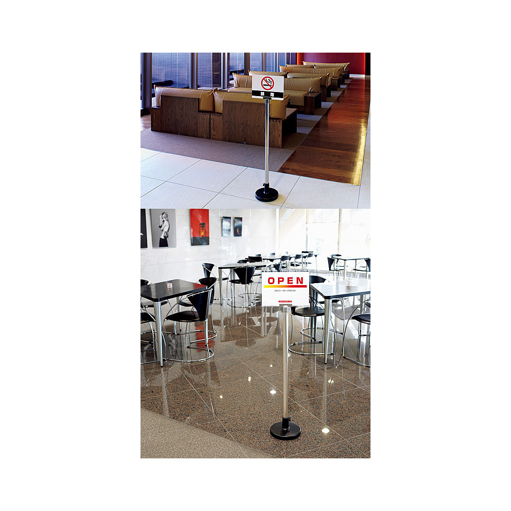 - ●ステンレスポールのスタンドに簡単にサインを取り付けて表示することができます。