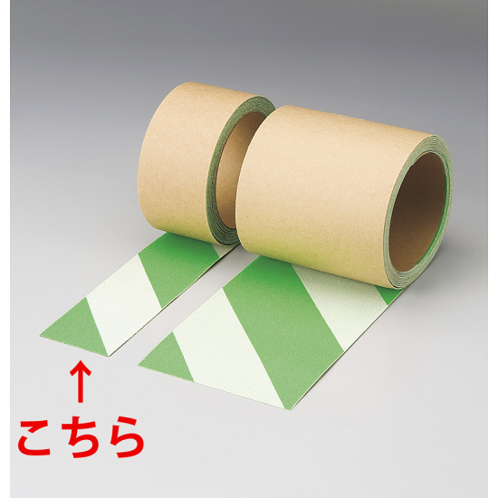 白と緑のストライプ柄の蛍光テープ式すべり止めテープ。2種類の幅からお選び下さい。