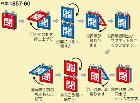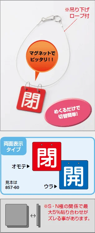 ピッタリくっつき、スッキリ見える。2枚の表示板が、磁力で合体!開閉表示の決定版!