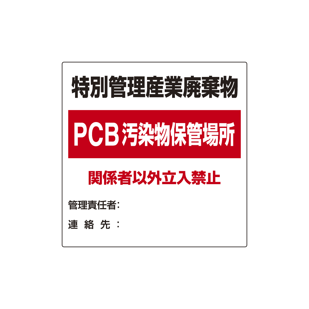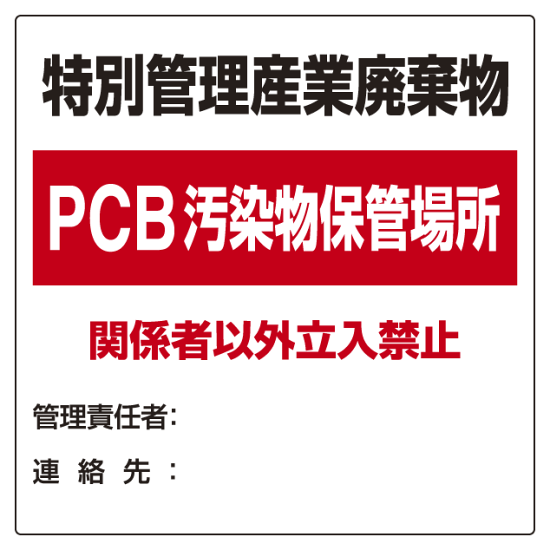 商品説明:廃棄物標識 特別管理産業廃棄物 PCB汚染物保管場所 ボード600×600 (822-94)