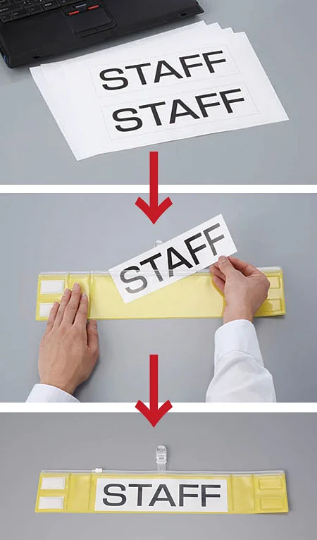 - 上部クリップ付きで装着しやすく、表示用紙を差し替えて使えるファスナー付腕章です。