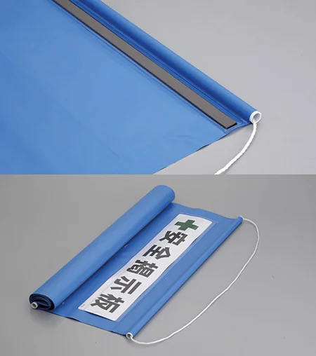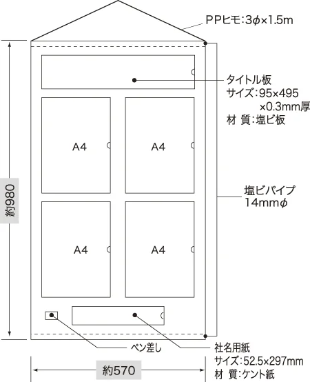 - 材質:ターポリン(裏面上下ゴムマグネット入り・上下パイプ入り・吊り下げヒモ付・上部タイトル板付・下部社名入れ用白無地板付)