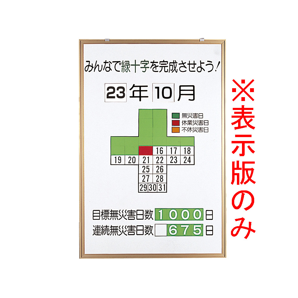 商品説明:無災害記録表 みんなで緑十字を完成させよう カラー鉄板/アルミ枠 900×600 板のみ (899-25)