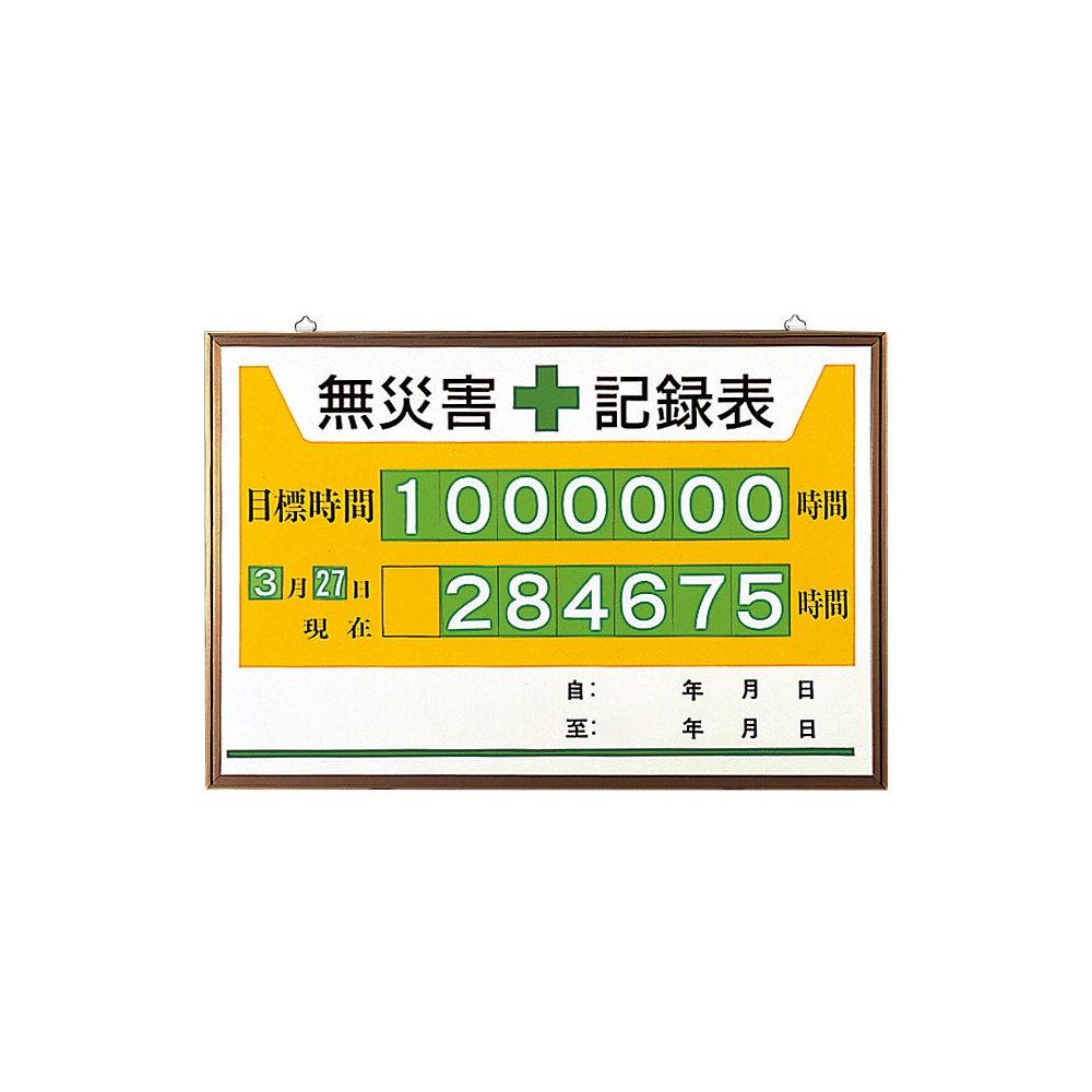 商品説明:無災害記録表 黄色地デザイン カラー鉄板/アルミ枠 600×900mm セット品 (867-12A)