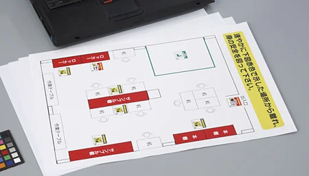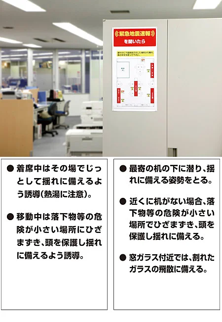 - ●地震直前の対応行動や危険場所の周知、安全場所への一時避難等職場環境に合った内容を作成し掲示できます。