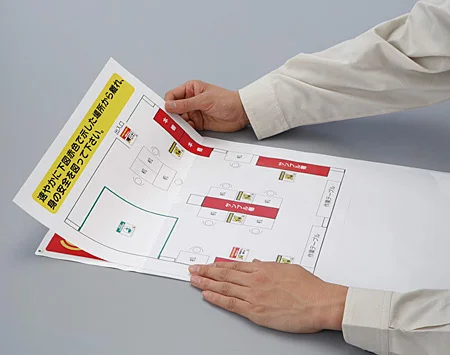 - ●用紙が差し替え式なので、室内や周囲の環境が変わっても簡単に内容変更ができます。