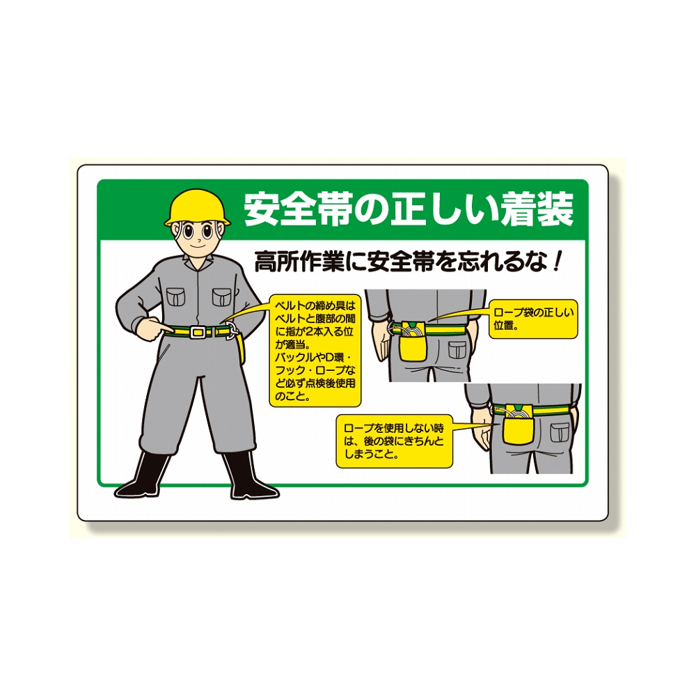 商品説明:安全帯関係標識 安全帯の正しい着装 (335-20)