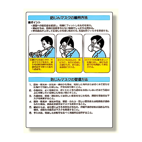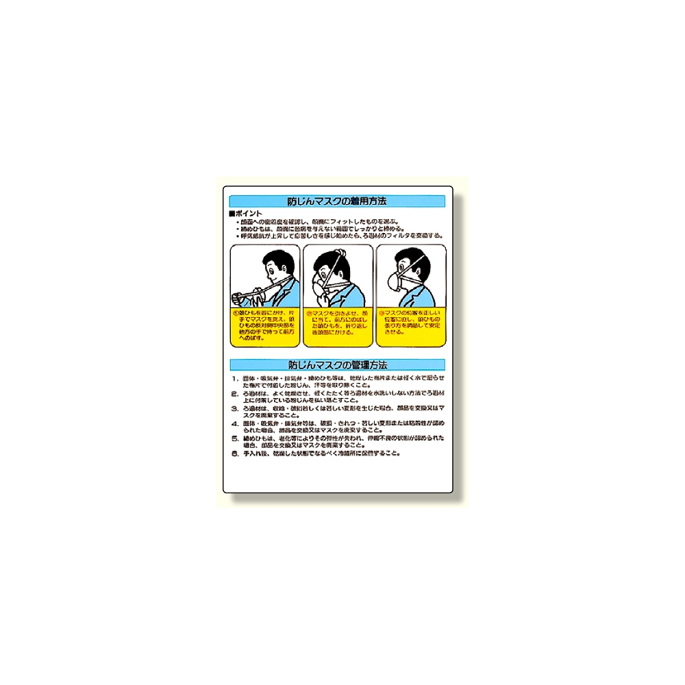 商品説明:粉じん障害防止標識 防じんマスク着用方法 (309-03)