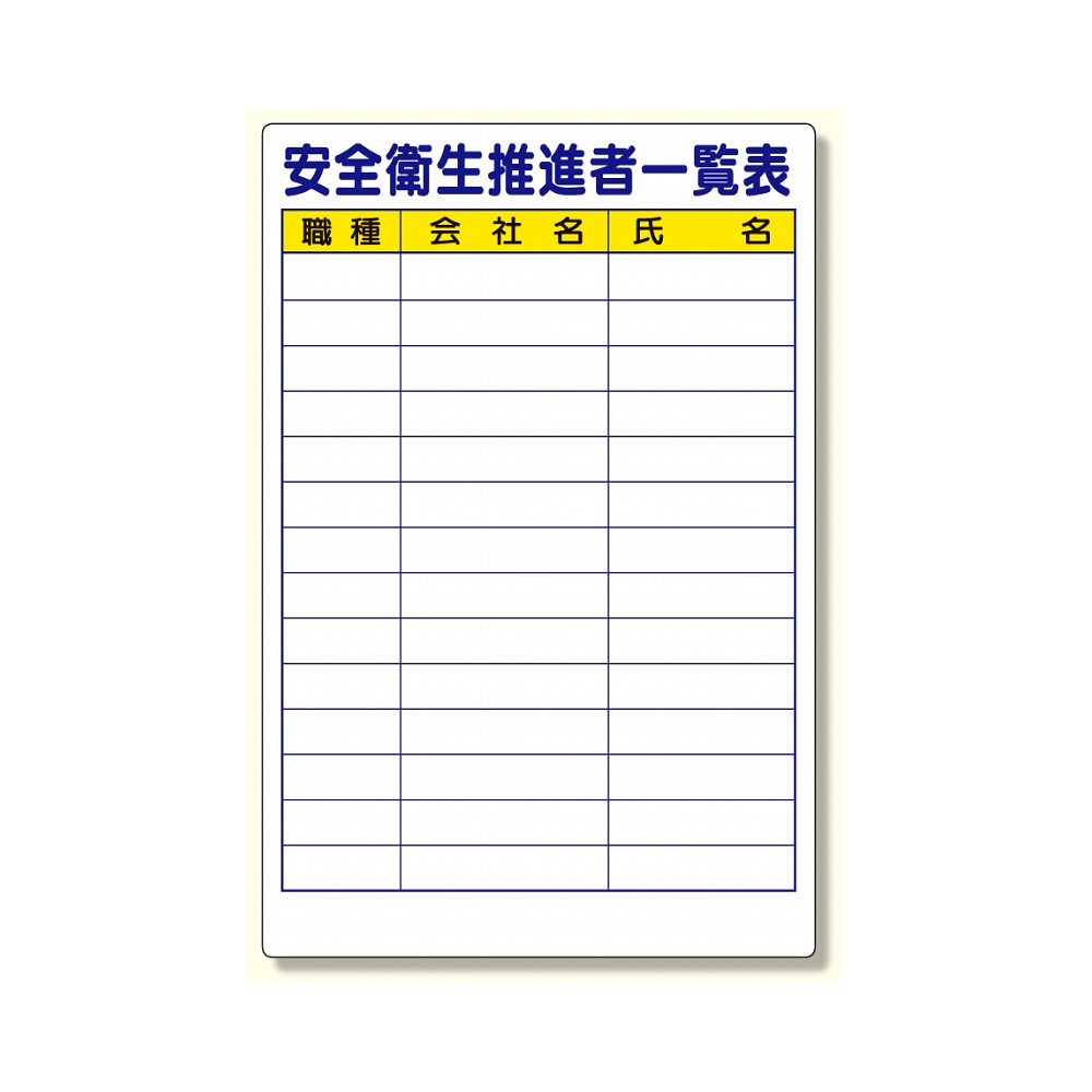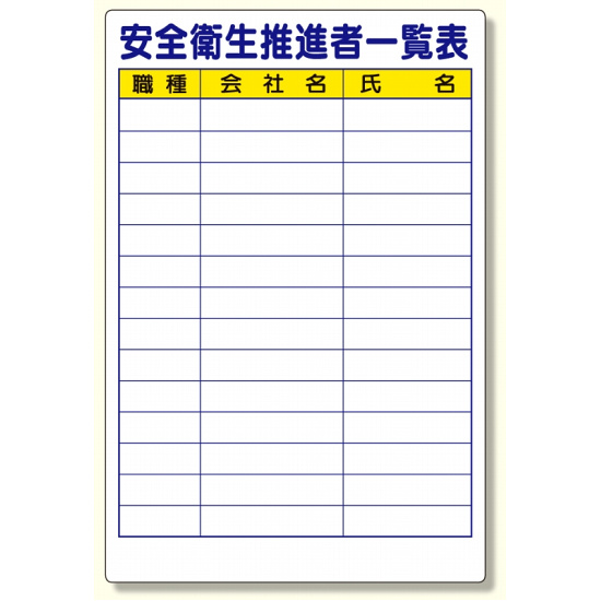 「安全衛生推進者一覧表 (355-07)」の導入をご検討中ですか? 大量注文・複数台のご検討に応じたお見積りのご相談、最短納期や送料、仕様・サイズの確認など、 作業主任者職務表示板選びをまとめてサポートいたします。