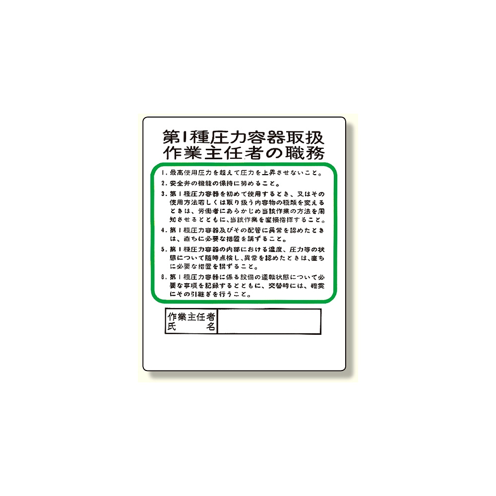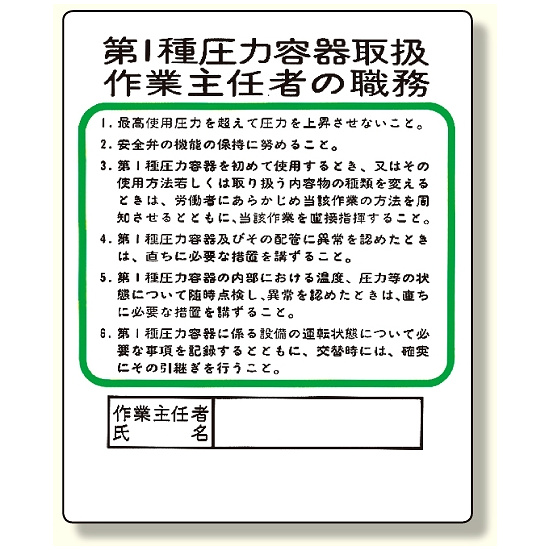 商品説明:作業主任者職務板 第1種圧力容器取扱 (356-12)