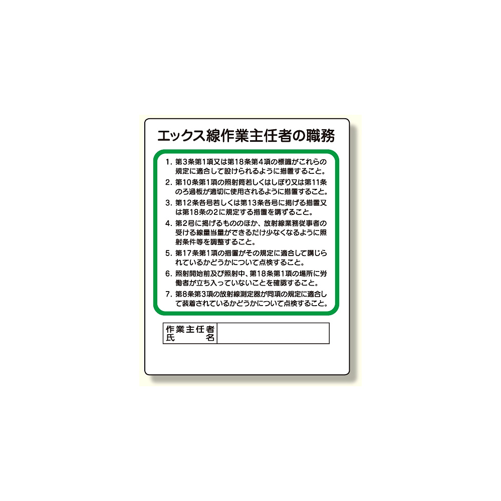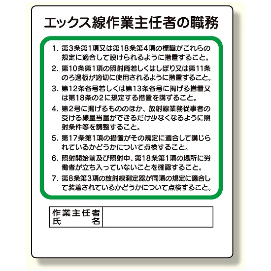 商品説明:作業主任者職務板 エックス線.. (356-16)