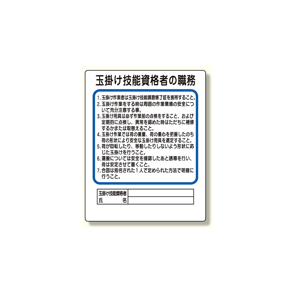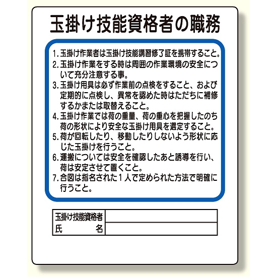商品説明:作業主任者職務板 玉掛け技能資格者 (356-30)