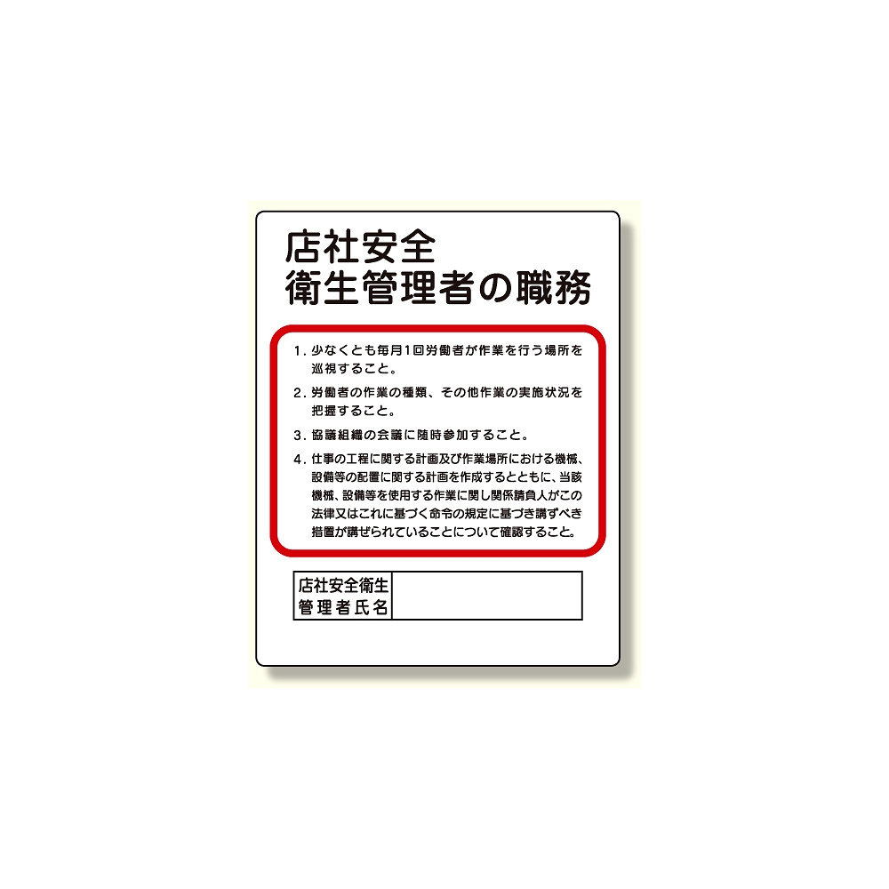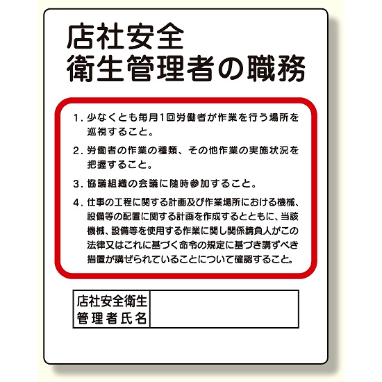 商品説明:作業主任者職務板 店社安全衛生管理者 (356-34A)