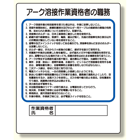 - 作業主任者職務板 アーク溶接作業資格者 (356-36A)