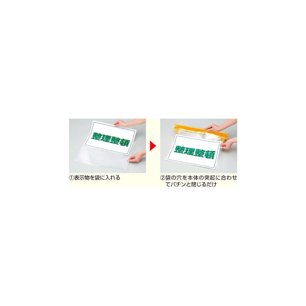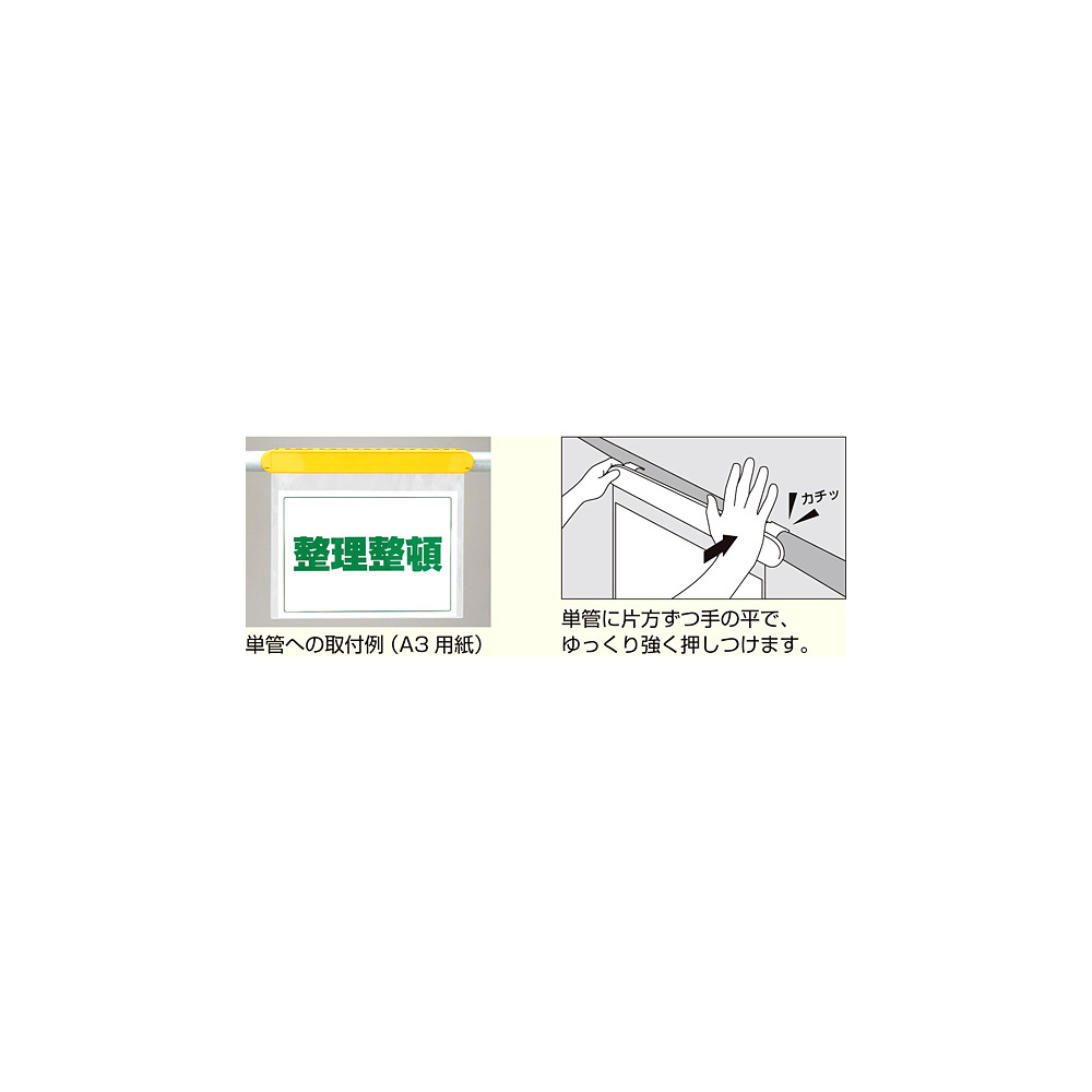 色々な用途に使えて便利な単管(48.6mmΦ)用バインダー!特許出願中 パソコンで製作出力した用紙を表示(A3サイズまで) ①表示物を袋に入れる ②袋の穴を本体の突起に合わせてパチンと閉じるだけ 単管に片方ずつ手の平で、ゆっくり強く押しつけます。