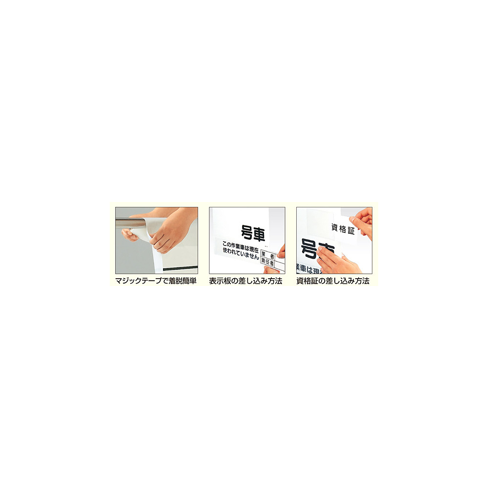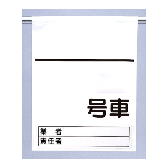 特 長 ●業者名が増えたり変更になった場合は、別売の表示板を増やすだけで対応OK。 ●記入してビニールポケットに差し込むだけ。表示板を抜けば不使用車の表示が現れます。 ●表示板や資格証コピーのポケットは横入れタイプ。ホコリや雨が入りにくくなっています。 ●裏面のマジックテープで着脱が簡単に行えます。